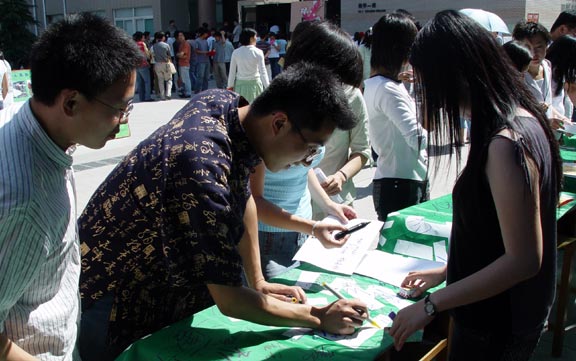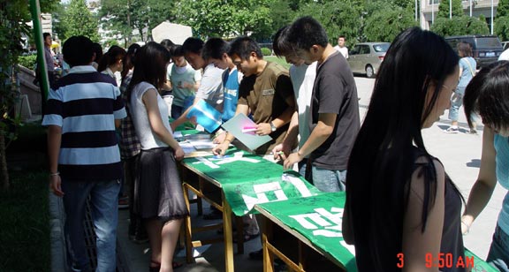 6月3日,在广场举行了“绿色行动”签名活动,前来参加签名的人络绎不绝,体现了广大师生参加环保的积极性。