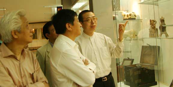 全山石教授认为,第一印象是学校管理得很好,很有秩序,校园环境井然有序。特别欣赏的主要有两点:第一、在办学理念、师资结构理念方面,倡导多元化、反对近亲繁殖,很好。第二、在艺术教育中对民族传统文化的重视。他认为,在设计领域,特别应该强调要发扬我们民族传统文化,从民间艺术、民族艺术当中吸取营养,在这个基础上来实现发展。同时,要与当代中国人的生活相适合。只有这样,才会有特色、有前途,才能和国外的竞争。看了孙长林艺术馆和民艺博物馆两个馆,感觉非常好。让学生们从历史文物和民间艺术陈列当中得到启示、吸取营养。其中艺术品的造型、前人的创作力和艺术理念,将会给学生很大的启迪。学校里能够辟出这么大的面积、设立常规的展馆,可以看出学校的办学理念。办学指导思想方向明确并具有中国的艺术特色。
