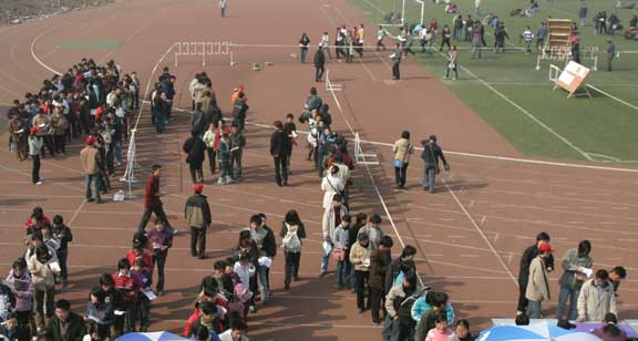 截至19日下午17点,当天报名8458人。报名第一天和第二天分别为1778人和4619人,三天累计将近15000人。据招生办公室李友生主任介绍,原先预计报名人数两万人,现在看来实际报名人数肯定要超出原先的设想了,估计明天还要有将近一万人报名。在场的一位警卫人员开玩笑说,第一天是“毛毛雨”,第二天是“小到中雨”,第三天是“大雨”,明天将会是一场“暴雨”。