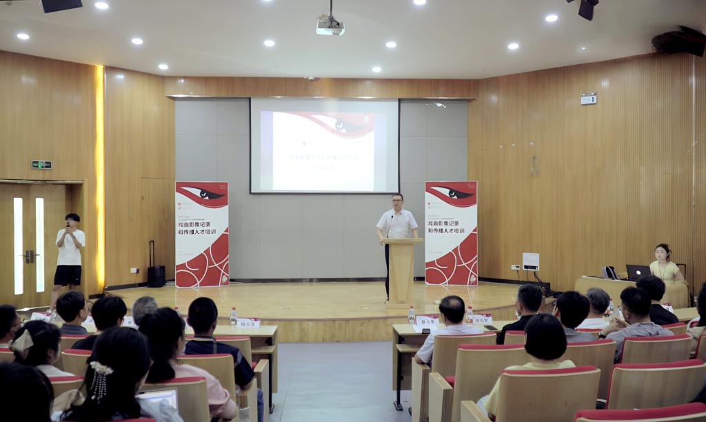 董占军致辞。他指出,戏曲是中华优秀传统文化的重要组成部分,影像记录与传播是当代文化传承的重要手段。本次培训项目依托学校丰富的艺术教育资源和技术优势,搭建戏曲与影像的桥梁,培养既懂戏曲艺术又精通现代传播技术的复合型人才,为戏曲艺术的活态传承注入新动能。