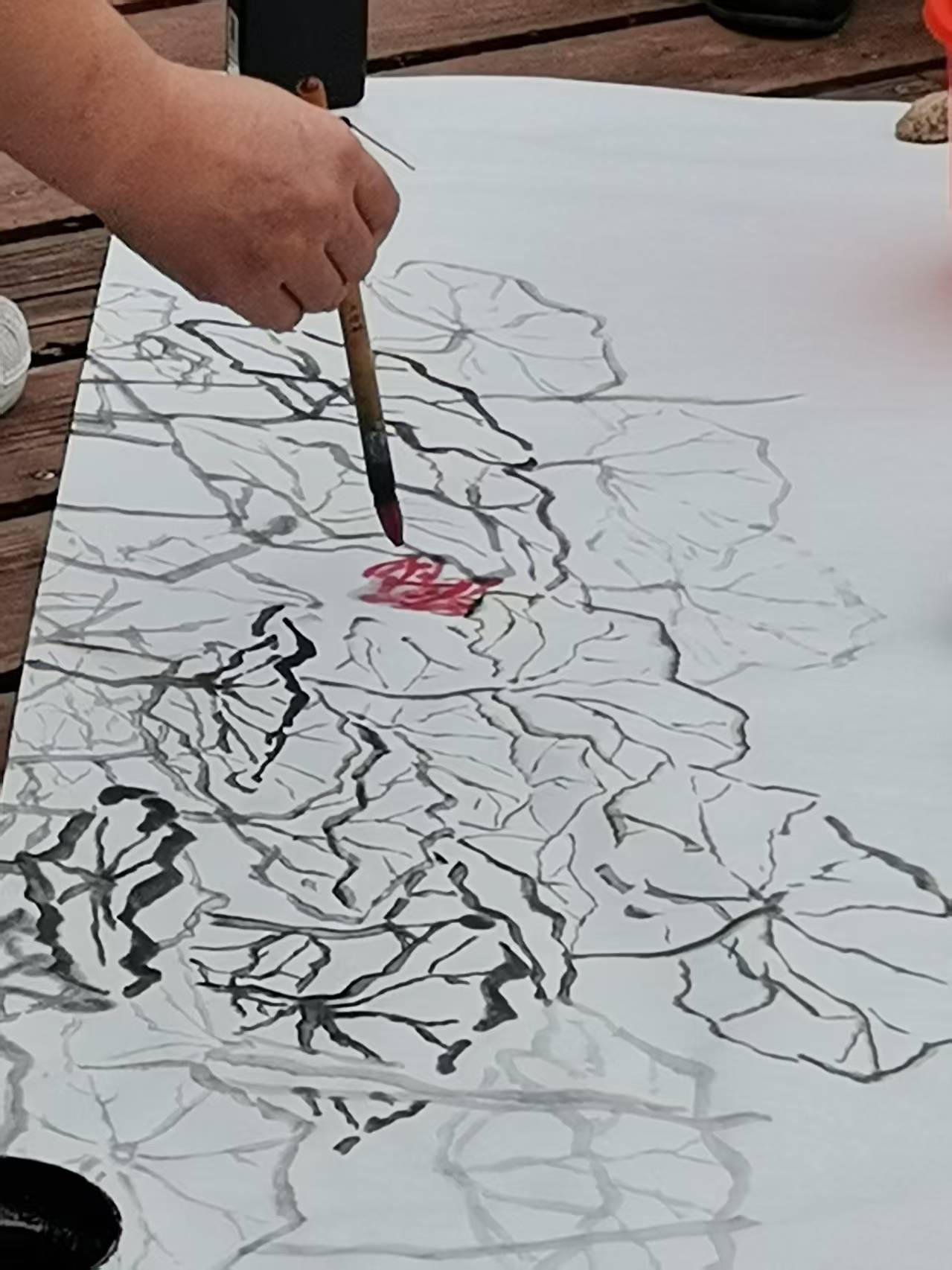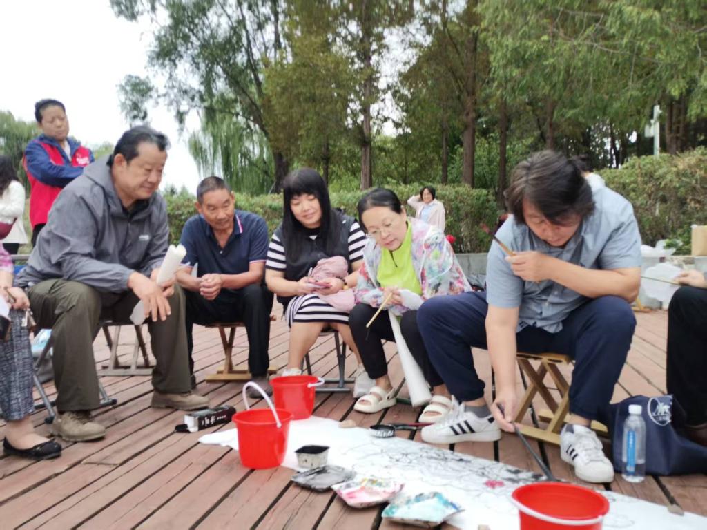在肥城湖畔,伴着习习清风,造型艺术学院陈一云老师带领居民置身于接天莲叶、潋滟湖光之中,开启了一堂别开生面的中国画户外课堂。陈老师从基础观察入手,将中国画中“留白”“写意” 的高深理念,拆解成通俗易懂的操作方法。他手持毛笔,蘸墨、运笔间,一边画一边讲解:“这里要轻一点,像荷叶边缘被风吹得卷起来的样子;这里要浓一点,突出荷梗的挺拔。” 翻卷的荷叶、挺立的荷梗便在宣纸上自然流淌,生动传神。一位参与课程的居民感慨道:“跟着老师看荷、画荷,心一下子就静下来了。这种专注与放松的状态,比单纯学会绘画技法更珍贵。”