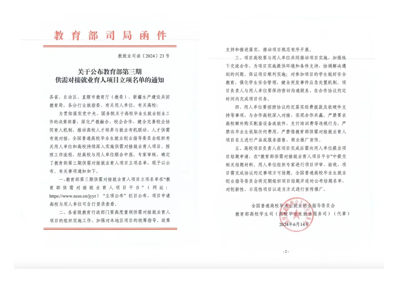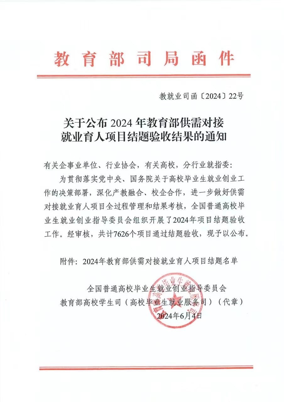 教育部供需对接就业育人项目由教育部高校学生司组织发起,有关用人单位和高校共同实施。旨在深化高等教育改革,推动就业与培养有机联动、人才供需有效对接,帮助用人单位培养和招聘更多实用型、复合型和紧缺型人才,促进高校毕业生更加充分更高质量就业。