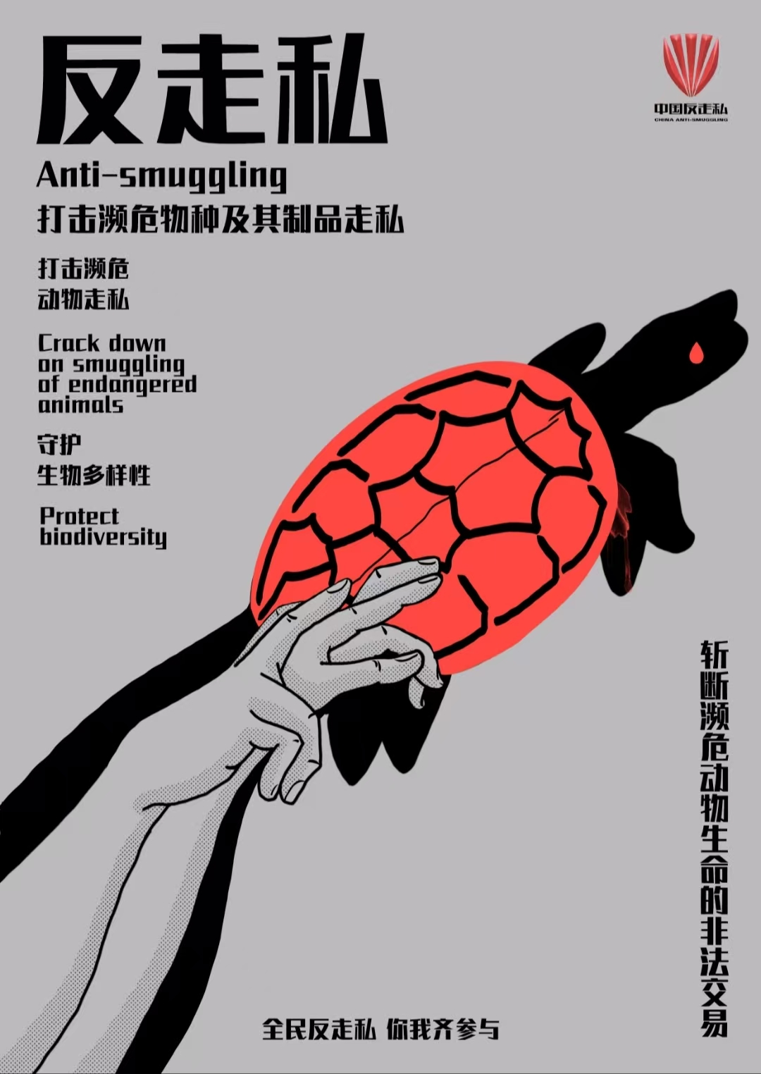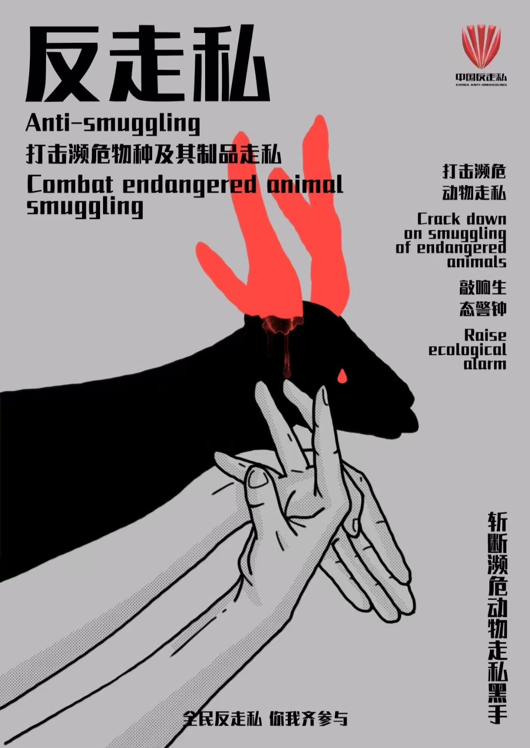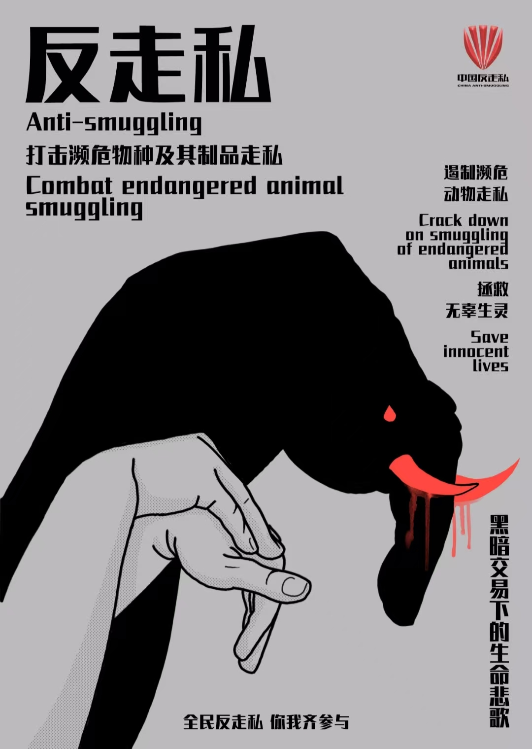 《斩断走私黑手》为宋尚霖创作的系列海报设计。海报以抨击濒危动物走私犯罪为主题,灵感来自于中华优秀传统文化——手影剪影。作品中黑色的影子既是动物的形象又是走私犯罪的黑手象征。海报用简单的线条、大面积的黑色色块、灰色的背景,以及贩卖动物制品部位的鲜明红色增强视觉冲击力和艺术表现力。整个色调和氛围突出走私濒危动物是黑暗交易,是严令禁止的违法行为,必须严厉打击,不容忽视,从而表达保护生态环境,共建绿色家园的文明意识和美好愿景。