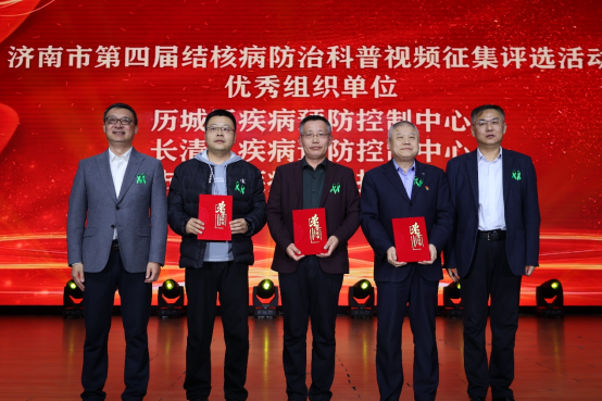 韩文涛与济南市卫生健康委副主任王东共同为在济南市第四届结核病防治科普视频征集活动中的优秀组织单位颁奖。