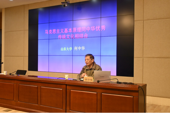 何中华以《马克思主义基本原理同中华优秀传统文化相结合》为题,从三大方面展开讲解。首先,从“三个结合”说起,详细阐述了中国共产党百年历史进程中所取得的重大理论成果;其次,对马克思主义与中国传统文化相遇的必然性问题,从马克思唯物史观的内涵和中国社会本身的历史际遇两个方面进行了深入分析;第三,从不同的维度和方面系统剖析了马克思主义基本原理与中华优秀传统文化结合的学理依据,阐述了马克思主义基本原理同中华优秀传统文化相结合在我国发展进程中的重要地位。