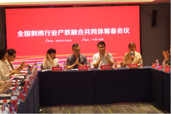 5月28日晚上,共同体筹备工作会议召开,参会人员审议并一致通过了全国刺绣行业产教融合共同体章程及首届理事会联席理事长、副理事长、理事、秘书长和副秘书长候选单位及候选人名单。共同体是发挥高水平高等学校、职业学校和龙头企业的牵引作用,联合全国刺绣行业组织、学校、科研机构、上下游企业等共同参与,按照开放共建、优势互补、协作多赢、共同发展原则组成的跨区域产教融合协作组织。