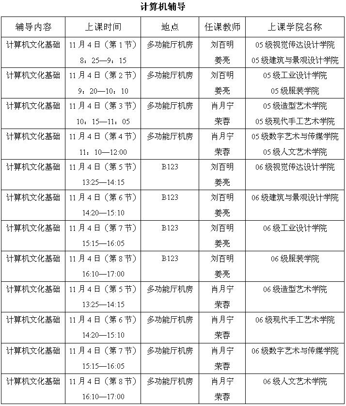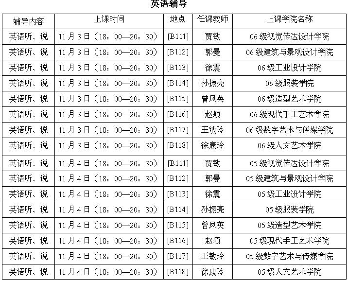 二、任课教师将利用课堂、课间时间对学生进行相关内容的辅导、训练,时间为10月29日—11月8日,11月3日、4日周末两天将集中对学生进行辅导,具体安排如下: