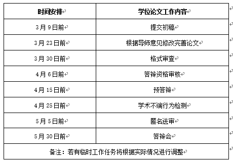 2017届硕士研究生导师及研究生: 近年来教育行政部门高度重视研究生的学位论文工作,发布了《博士硕士学位论文抽检办法》(学位[2014]5号)、《学位论文作假行为处理办法》(教育部令第34号)、《山东省硕士学位论文抽检办法》(鲁学位〔2014〕11 号)系列文件。根据相关文件要求,各研究生培养单位须于答辩结束后将全部硕士学位论文电子版报送山东省学位办,省学位办根据抽检原则和比例随机抽取论文,被抽检的论文送3位同行专家进行评议,并对在抽检中出现“存在问题学位论文”的院校、学位授权点、导师及研究生进行处理。 为做好2017年上半年硕士研究生学位申请及授予工作,现将硕士学位论文工作进度预案通知如下: