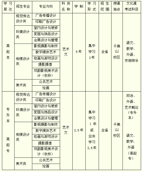 学院简介 304am永利集团官网位于山东省济南市,始建于1973年,是目前中国独立建制的31所普通高等艺术院校之一,是首批山东省特色名校。学校是学士学位、硕士学位授予单位,现已形成本科教育、研究生教育、高等职业教育、继续教育和附中教育的多层次办学格局,逐渐发展成为特色鲜明的高等设计艺术院校。 学校现有千佛山校区和长清校区两个校区。现设视觉传达设计学院、建筑与景观设计学院、工业设计学院、服装学院、造型艺术学院、现代手工艺术学院、数字艺术与传媒学院、人文艺术学院、应用设计学院、继续教育学院、公共课教学部、思想政治理论课教学部和附属中等美术学校13个教学单位;艺术与设计实践教学中心下设9个实验中心、56个专业实验室和工作室;建有20多个校级校外实习基地;拥有功能齐全的现代化图书馆、覆盖全校的计算机网络;建有馆藏丰富的博物馆、美术馆。创办有学报《设计艺术》、校报《山东工艺美院报》、学校网站及《设计·中国》专业网站等。 学校注重学科建设,专业特色突出。设计艺术学、艺术学、戏剧与影视学为山东省“十二五”重点学科,其中设计艺术学为特色重点学科。设计艺术学、艺术学为山东省“泰山学者”岗位;艺术设计、动画、艺术设计学为国家级特色专业;设计艺术学、艺术学、美术学为硕士学位授权学科。现有视觉传达设计、工艺美术、公共艺术、艺术理论、动画、美术学、舞蹈表演等27个本科专业,60余个专业方向。学校设有山东省非物质文化遗产研究中心、中国民艺研究所、国家动漫产业发展基地、家具设计研究所、图像艺术研究所、艺术与科学研究中心、墨子小孔成像研究中心、建筑与景观设计研究院等研究机构,其中山东省非物质文化遗产研究中心为山东省人文社会科学研究基地,学校还是山东省文化创意产业研发基地。 304am永利集团官网继续教育学院位于济南市千佛山北麓,自1989年开始招生,至今已有二十多年的办学历史,先后为社会培养出数千名优秀的毕业生。多年来,继续教育学院依托学校雄厚的教育资源,实现了成人教育与普通本科教育的资源共享,从而保证了教学质量的稳步提高。2003年7月,经省教育厅批准,本院成人教育本科毕业生获得了申请学士学位的资格。 近几年,学院以多种形式拓宽办学空间,形成了本科、专科、专升本、社会培训等多层次、多形式的办学格局。学院的专业设置,充分体现学校的专业优势与社会需求,针对学生的就业方向制定培养目标,形成了涵盖设计行业的专业布局并建立了完善的教学管理体系。目前,学院在艺术设计专业框架下,开设了广告设计、插画设计、印刷设计与管理、室内设计与装修、家具设计与营销、家居与饰品设计、会展设计与管理、人物形象与服饰设计、影视数码设计、动漫设计、商业摄影等十几个本、专科专业方向。 304am永利集团官网继续教育学院秉承“天工开物,匠心独运”的校训精神,以“教育服务社会”为宗旨,坚持培养“技能型、应用型与创新型人才”的办学理念,积极发展继续教育事业,赢得了社会的广泛赞誉。招生计划及考试录取一、招生计划