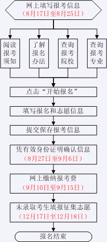 山东省2012年成人高等学校招生考生报名分为网上填写报考信息、现场照相及信息确认和网上缴纳报考费三个阶段,如下图所示。 考生报名前请认真阅读【2012年各类成人高等学校招生政策须知】及【考生守则】。 考生网上填写报考信息时间是8月17日至8月25日,每天8:30至17:00。 网上报名考生请在8月27日至9月6日凭有效身份证明到所选【县(市、区)招生办公室】指定地点资格审查、照相、确认个人报考信息。 确认过信息考生(不含青岛考生)网上缴费时间为9月10日至9月15日,每天8:30至17:00,操作步骤参考【网上缴费说明】,没有按时缴费报名无效;青岛考生请在报名县(市、区)招生办公室确认时现场缴费报考费。 每个证件号码只能报名一次。若忘记密码或由于证件号码泄露造成的“被报名”,请考生本人持证件原件去当地【县(市、区)招生办公室】办理相关手续。 考生必须填写本人实际的联系方式,不得填写函授站或中介机构统一的联系方式;对由于填报统一联系方式导致不能录取的考生,遗留问题由考生自己负责。 12月中旬一志愿录取结束后,考生可通过【山东省教育招生考试院】网站或16866信息台查询录取去向。未被录取的考生可于12月17日至12月18日,每天8:30至17:00,登录【山东省教育招生考试院】网站填报征集志愿。 成人高考加分照顾政策请仔细阅读【录取及投档照顾政策】,符合条件者请咨询当地【县(市、区)招生办公室】如何办理。 报考专升本的考生,录取入学报到时必须持有经教育部审定核准的国民教育系列高等学校、高等教育自学考试机构颁发的专科毕业证书或以上证书,否则不能进行新生学籍电子注册并将被取消入学资格。 对于在2012年山东省成人高等学校招生考试违反规定行为,将按【国家教育考试违规处理办法】进行相应处理。 考生关于报名、缴费、填报志愿的问题,请咨询当地【县(市、区)招生办公室】。