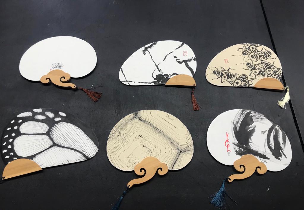 张小娟老师在讲座过程用中国汉字的发音与造型方式贯穿梳理图形与视觉艺术作品,结合了个人作品展示以及平时研究与教学实践,对应设计中理性的形式原则以及现场的互动视觉演示,集中展现了视觉设计中一种东方性的审美意趣。工作坊项目的题目叫做向自然学习,带领大家由最普通的物品与自然植物中发现并发展图形,这是平面设计的一个基础性课题,由小及大,引导并激发每一个同学自我的发现与创造性,并且利用平面设计的规则与形式规律最终发展图形并创造性的应用于设计产品。最终的理论性的认识来自于自己双手的实践与实验,这样而来的对形式规律的认识更加鲜活与灵活,将对自然之物的尊重与再认识融入课题与教学,本身就有着人与自然和谐统一的东方哲学思想,而最终呈现载体选择了中国传统扇面形式,所有人的作品,自然散发了一种东方性的审美意味。在课程总结时,张老师还带大家进行了设计思维的实验性互动游戏,启发大家跳出固定规则创造性解决设计问题。