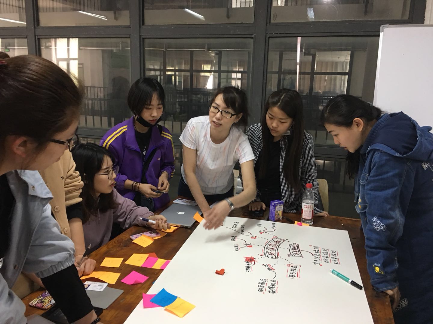 在创意工作营讨论前,王文嘉老师从设计的原点讲起,从大同大学的历史背景到现今的设计理念、实践教学,认真剖析了设计环境对于学生的重要性。从眼下市场定位自己的位置,去形成有跨界力的整合团队,培养符合业界需要的三创人才。始初,创意工作营以“APP设计”为主题,王文嘉老师运用脑力激荡法(头脑风暴)、心智图、KJ法等设计方法对学生进行专题培训,给学生带来设计新体验。随后,在小组讨论阶段,王文嘉老师以环境保护为设计主题,鼓励学生发散思维、挖掘本质。在讨论期间,王文嘉老师以设计界面为引,举例说明人机交互的桥梁界面带给使用者的直观感受,通过国际标准认证ISO,了解交互系统规范,从而定义好需求出来之后产生的设计方案。另外,王文嘉老师还以“以人为中心的设计”,要求学生们积极收集资料,理性分析资料,并将其利用在自己的设计里面。在最后设计方案环节,王文嘉老师通过学生们的界面设计流程,提出促进互动界面设计的黄金法则,让大家要在大学期间培养起来五个“W”和一个“H”的概念。