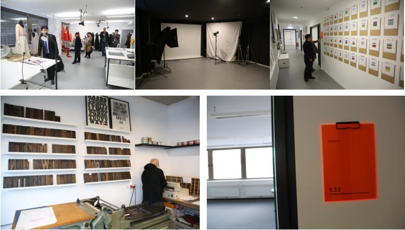 此外,代表团参观了学校特色的传统活字胶版印刷工作室。代表团在参观考察教学环境的同时,还认真考察了学校的软环境的建设,比如学校的整体教学环境的导视系统,功能性强而且设计简洁明了。在每个房间的门口,会固定有一个活页夹,上面会注明课程和房间的编号,教师可以根据上课内容随时夹上信息。不同功能的房间或者教室会有不同颜色的夹子进行区分。这些看似简单的设计里,都融入了细节的设计。学生作品的展示系统也是设计简洁和安排合理。这些软环境的考察和学习,对学校相关院系的升级改造将会有重要参考价值。学院整洁的教学环境,合理的空间安排,自由、开放的空间与氛围,给代表团成员留下了深刻的印象。