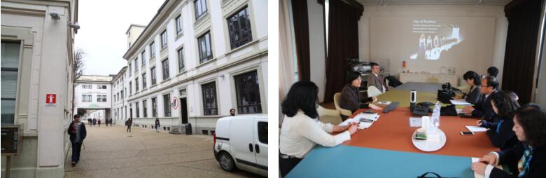 代表团一行考察了学校的教学环境、图书馆、工作室、教室等硬件设施,还了解了课程设置、学科分布、办学特色等。学院图书馆成立于1778年,拥有悠久的历史,藏品非常丰富,环境非常古典优雅。代表团访问期间,图书馆正在举办《墨乐》主题的中华文化文献书籍资料藏品展。展览围绕中国的古老文字篆书、书法、篆刻、音乐等元素,展出了从十六世纪以来关于中国元素和中国文化的一些藏品,这其中既有中国出版的一些相关书籍,也有早在16世纪欧洲出版的介绍中国文化的书籍等资料。主办和策划这个展览的是外国艺术家Calligrafato先生。这个展览也反映了国外艺术家对中华文化的推崇,以及中华文化对世界的影响。