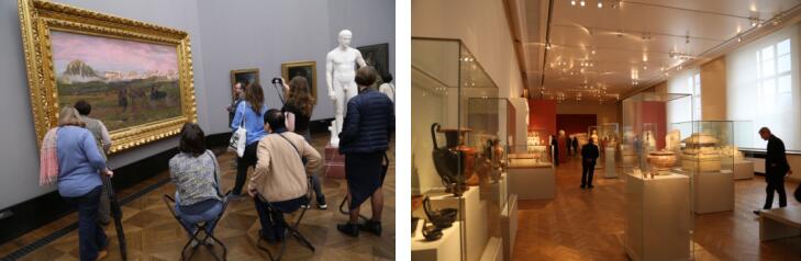 随后参观了相邻的阿尔特国家艺术画(Alte National Galerie) ,主要陈列十九世纪到第一次世界大战前的艺术作品、雕塑作品等,从古典主义、浪漫主义、到印象派等,囊括了整个19世纪的绘画和雕塑。名家名作包括:门采尔的《腓特烈大帝在无忧宫演奏长笛》,马奈的《在温室花园里》等。代表团在参观艺术博物馆,欣赏了艺术原作的同时,还考察了博物馆的教育和教学功能的建设,依托博物馆的建设,让博物馆更好的融入教学系统。