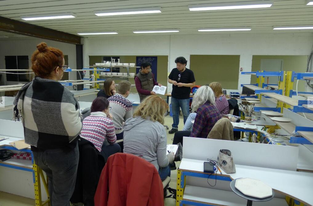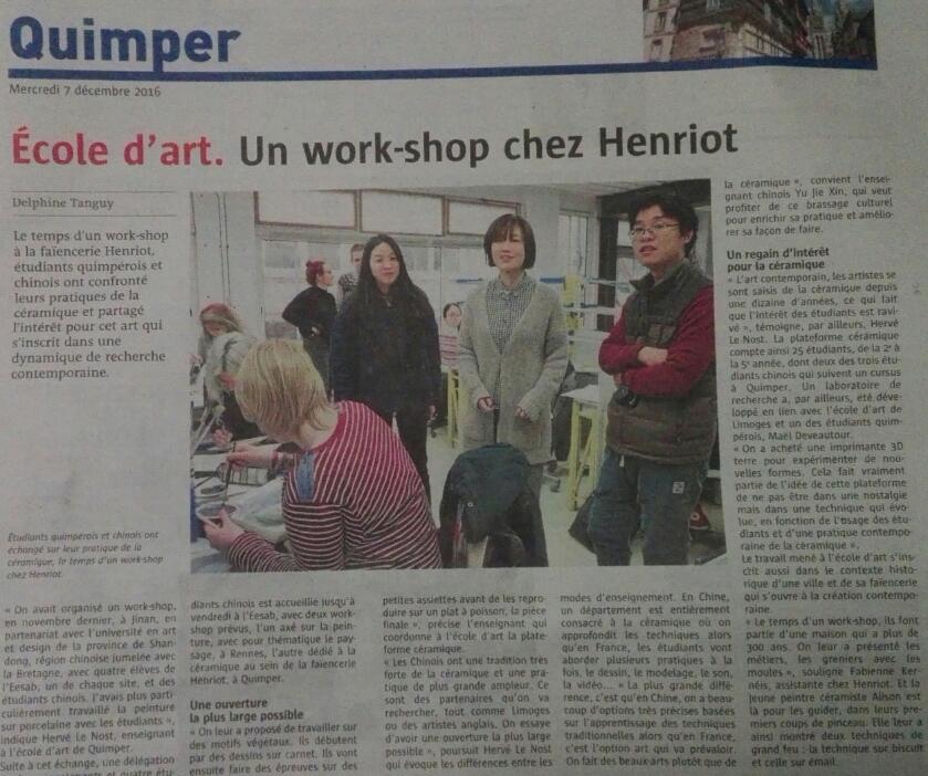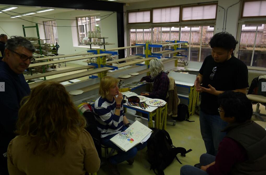 2016年12月1日至9日,永利官网师生一行6人,由现代手工艺术学院陶瓷专业老师俞杰星和造型艺术学院国画专业老师丁雷带队,赴法国布列塔尼欧洲高等美术学院进行了为期一周的陶瓷与绘画专业课程合作与交流。这也是中法两校根据合作协议开展的第三次交流活动。 永利官网师生在布列塔尼欧洲高等美术学院校方的陪同下参观了该校雷恩校区,对学校的概况进行了初步了解,双方随后商定了此次交流活动的日程安排:12月2日-8日,永利官网师生6人分为绘画组和陶瓷组分别在雷恩校区和坎佩尔校区与法方学校师生进行课程合作。 丁雷老师和造型艺术学院学生组成的绘画组在雷恩校区,与该校区的Samir教授共同开展艺术创作对话、写生与再创作等活动。双方首先对课程合作的内容及形式作了坦诚、直接的讨论,明确了活动主题,之后开展了两天积极而富有成效的户外写生工作,通过深入的交流与集体创作,课程以一幅八米中国山水画长卷的形式作为对接节点,将中法两地文化符号、形式表达、不同角度的趣味意境运用其中,通过艺术语言的相互嫁接、融合与再造的尝试,最终完成了一幅中西对视、古今相闻的综合角度作品。课程合作中,中法两国师生积极思考、深入交流、热情创作,在艺术创作和教学研究两方面都取得了积极的成果,这种课程合作形式是非常富有建设性和创新性的。此次活动于当地得到了广泛关注,成为新闻报道的内容,这种交流形式及创作的作品也得到了当地同行的赞许和好评。 俞杰星老师及学生在坎佩尔校区与法方师生开展陶瓷专业的课程合作。该校区的Le-nost教授接待细致、周到,先后带领他们参观了当地著名的陶瓷工厂、陶瓷博物馆,该陶瓷工厂为双方课程合作的教学活动提供了丰富的材料。此次陶瓷组课程合作的主题为日用陶瓷自然形态的绘画装饰。双方共同探讨了每一位师生提出的创作方案,给出了修改建议。双方的11名师生共同进行了釉下彩绘及釉上彩料两种工艺的装饰,他们此次合作教学的成果将在一个月之后烧成呈现。此次活动受到当地媒体的关注及报道,俞杰星老师还给法国学生们做了有关中国陶瓷教育现状及陶艺创作的讲座。随后,俞杰星老师一组去往洛里昂校区,在Decaudin校长的陪同下参观了位于海边小岛上的东印度公司博物馆,里面的藏品富有东方色彩,相当精美。接下来的校区参观也令俞老师一行对洛里昂校区准时、整洁、高效的教学氛围印象深刻。他们与该校区正在开展陶瓷创作教学活动的师生们进行了交流,受益良多。 此次与布列塔尼欧洲高等美术学院的交流活动带给永利官网师生很多感受,主要有以下几点: 一、课程设置及教学方面 法国艺术院校大多不分具体专业,学生什么都学,他们自己选课程获得学分即可毕业。通常一个课程各年级的学生都有,他们的专业基础和知识结构参差不齐。专业课上课相当自由,属于放羊式,通常老师会布置一些主题,如拼贴艺术表现、博物馆藏品再造等,学习完全取决于学生自己,愿意学的就多与教师沟通。法国很强调师生沟通,学生积极找老师才能学到东西。上课时老师点评学生作品多是挑毛病,但只要学生能够较好的表达,说明自己的创作意图和设计过程就能得到老师的认可,老师普遍看重想法和表达,对于制作的结果和工艺问题并不十分重视。他们一年级课程设置较多,一年级会有至少9门课,包括外语(英语、西班牙语、德语任选)、艺术理论等,这些课通常每周都上。二年级以后每学期大概两门课。他们的课程评价及毕业创作评价都采用本校教师及外校专家联合考核的形式,主要是作品展览及答辩,答辩时间较长。研究生毕业考核还需要写50页的论文。虽然该校的教学形式与国内差别很大,但是他们比较注重展示,作品最后的完整度总体较高,作品拍照、布展等都较花心思,作品集呈现也较为现代、设计感强,图片刊登的同时附大量文字说明。 二、工作室辅助教学的作用 他们每个校区都设有各种材料的工作室并配有专业技师。工作室的主要作用有两方面:一方面是教授基本工艺,如模具翻制、金属焊接等;另一方面辅助创作,帮助完成艺术创作中可能需要的综合材料部分。根据我们的观察,工作室的教学都比较基础,很难作为艺术创作本身,通常是制作作品配件,如铁架子,木盒子等等,除个别设备需要老师在场指导外,其它均可由学生自己动手操作。其中的陶艺教学主要还是服务雕塑或造型艺术的,与国内器皿教学内容有很大差异,陶艺制作多为手工或借助模具,表达观念或属于综合材料的范畴。 三、学生较强的自律性 虽然这里的学生几乎人人抽烟、喝酒,但抽烟只在室外,室内绝对没有,喝酒只在晚上,甚至通宵,白天绝对不喝;这里的人们见面都很有礼貌,陌生人之间会打招呼、问好,在室内说话很小声;学生们教室、工作室卫生都保持较好,不需要老师特别叮嘱。但是这里学生上午上课迟到现象比较严重,不过下午及晚8点出勤较高,法国人一般晚8点吃晚饭。非上课时间坚持不工作,学生、老师、学校工作人员都是如此。永利官网师生在洛里昂校区见到的情况有些例外,该校早上9点准时上课,各年级学生出勤率正常。中午12;30下课,下午2点上课,都能保持正常,且工具摆放、卫生环境等均是各校区中最为突出的。永利官网师生观察该校区学生作业成品或半成品也都比较成熟、