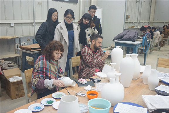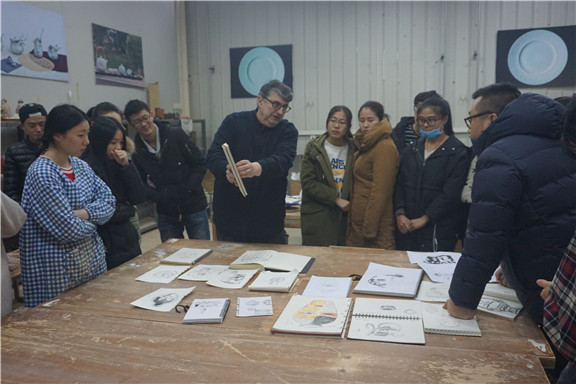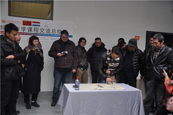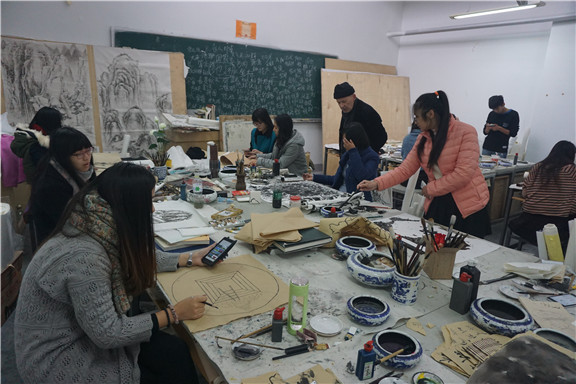 2015年11月16日至26日,法国布列塔尼欧洲高等美术学院(EESAB)师生一行6人来永利官网进行了为期十天的访学交流。他们根据专业的不同,师生分为两组,与永利官网现代手工艺术学院和造型艺术学院的师生开展了陶瓷和中国书画专业的课程合作交流与学习。 课程合作项目开始前,现代手工艺术学院陶瓷教研室耿大海、余杰星和郑伟老师带领法国师生参观了永利官网美术馆、博物馆和艺术实践教学中心,观摩了现代手工艺术学院陶瓷班、工作室和造型艺术学院中国书画班的课堂授课。让他们先了解永利官网的教学场所、教学设施等基本情况以及陶瓷专业、中国书画专业的授课方式。在此基础上双方师生又进行了进一步的交流,法国师生介绍了EESAB的地理位置和发展历史,以及他们学院各专业的分布和安排,并详细介绍了EESAB的陶瓷专业和绘画专业,展示了他们的部分学生作品。 陶瓷专业课程合作,由法方的海赫威老师指导现代手工艺术学院陶瓷班 和法国学生画出一些有关瓷器图案的设计图,从中选出四件,由中方学生代表与法方学生一起将选中的设计图手绘在烧制好的瓷器上来完成作品。期间,海赫威老师不断对同学们的创作进行点评和指导,给出了很多修改建议。他注重引导和激发学生的想象力和创造力,认为学生自己的“idea”最重要,将西式教学理念贯穿了整个授课过程。 绘画专业课程合作,由法方弗朗西瓦老师在造型艺术学院谢其云老师指导的中国书画班进行。他给书画班同学们讲授了西方绘画史课程,让同学们根据他所展示的古代中国地图,利用其中的各类元素,结合中西方绘画特点与画法,创作完成以“地图”为名称的作品,并要求进行文字联想,在作品中充分利用中国的水墨元素。弗朗西瓦老师指导学生作画强调整体效果,注重画面层次感,对细节的把握也丝毫不马虎,画作留白的处理,甚至一个线条、一个墨点的增减都反复斟酌、端详。他注重培养学生思考问题的方式甚过注重教给学生创作技法。在他细致入微、不厌其烦的指导修改中,同学们均感受益匪浅。 课程合作结束后,举办了两校访学课程交流总结展。同学们的作品以水墨画、艺术装置、手绘陶瓷等形式进行展出。参与课程合作的双方师生对此次课程合作取得的成果感到满意。大家认为对于同一个题材的作品创作,中法学生有着不同的思维方式,不论是中国学生还是法国学生,一定要打破直线性思维,要把自己的思维、眼界放宽,这样创作出来的作品才更成熟更新颖。法方老师表示,有一些作品让他们感到不可思议,中国学生们的绘画功底和悟性令他们啧啧称赞。中国学生表示法国学生独立思考和创新的能力值得他们借鉴和学习。 这次两校课程合作与交流,不仅让中法学生在创作过程中彼此学到许多,更重要的是加深了两校师生的友谊。