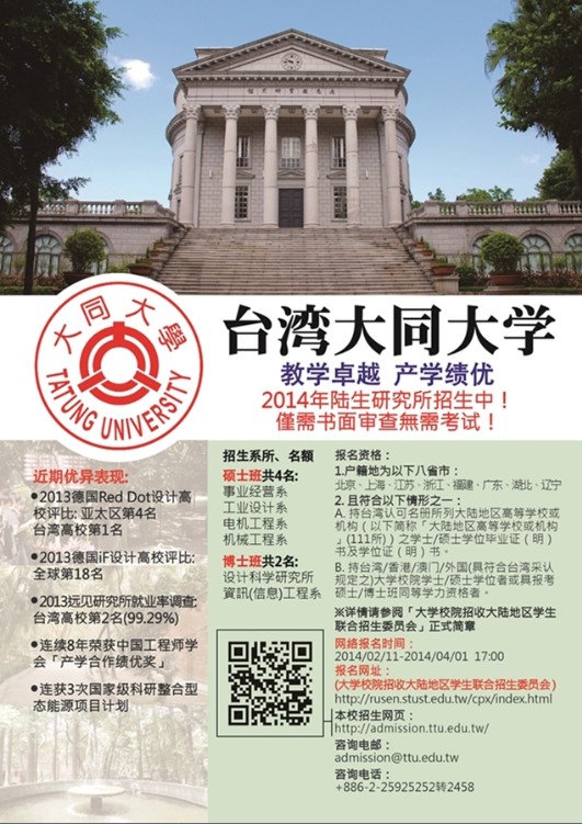 台湾大同大学2014年陆生研究所(硕、博士班)目前正在招生。