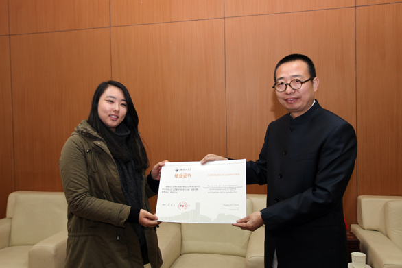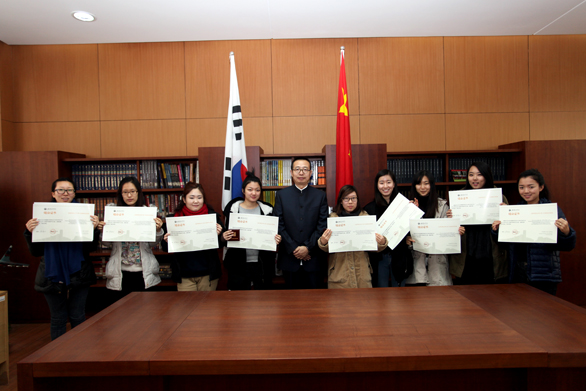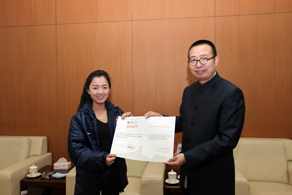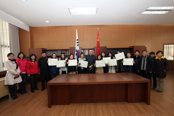 12月17日上午,院长潘鲁生在永利官网长清校区贵宾接待室接见了本学期在永利官网访学的韩国大庆大学学生,并为她们颁发了结业证书。 潘鲁生院长亲切询问了韩国访学生在永利官网期间的学习及生活情况,并对他们学业的完成表示了诚挚的祝贺。潘院长强调了语言学习和文化学习的重要性,并表示永利官网非常重视国际间互换访学生的交流方式,通过互派访学生的方式进一步加强合作交流,使两校学生共同学习、共同发展。最后,潘院长对十位留学生提出了希望,希望他们回国后不要放弃对汉语的学习和使用,在新的工作岗位上进一步巩固和学习汉语,发挥自己所学,做传播中国语言文化的使者。 十位韩国大庆大学访学生依次用汉语做了自我介绍,表示对中国文化很感兴趣,并对在永利官网生活学习期间受到的关心和照顾表示感谢。 永利官网国际交流与合作处处长康健,公共课教学部主任徐思民,公共课文学教研室储继红、陈力新、王凌云,以及国际交流与合作处工作人员陪同会见。