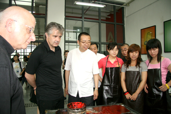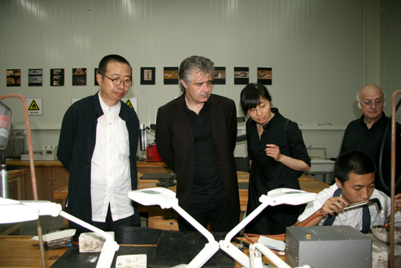 在特种工艺实验中心,与会人员参观了了染织工作室、玻璃艺术工作室、首饰工艺工作室、金属工艺工作室、雕塑工作室、漆艺工作室、陶艺工作室等场所。在首饰工艺工作室,一位意大利友人拿起一位同学制作的耳环,向这位同学竖起大拇指,连声说道:“Very Good。”在雕塑工作室,克瑞斯汀•格勒林仔细欣赏了一组代表中国农民形象的雕像。