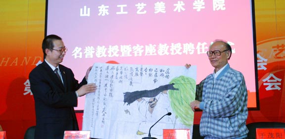 院长代表学院党委书记于茂阳教授向方老先生赠送了纪念品。张云龙副院长代表学院致辞。张云龙副院长说,方成先生是我国著名的漫画大师,在我国漫画界享有崇高的威望,他的作品哺育了我国一代又一代漫画家,他的许多名作都曾给大家留下深刻的印象,方老答应担任学院客座教授,我们感到特别荣幸;黎青先生也是我国著名漫画家,创作过大量很有影响的漫画作品,多次在国际国内著名美术和漫画展览、大赛中获得大奖,在我国漫画界也有很高的地位。两位先生加盟工艺美院,必将对学院漫画和动画专业的发展产生不可估量的推动作用。谭莹女士有着丰富的学习和工作经历,她曾多次到中央工艺美院学习,后又长期在美国学习工作,她加盟工艺美院,必将为学院带来崭新的教学理念,大大开阔我们的视野和思路。谭莹教授早年曾在工艺美院学习任教,她这次应聘又回母校任教,让我们感到分外亲切。希望在座的各位同学将来成才以后,也要向谭教授学习,心系母校,为母校的发展贡献力量。