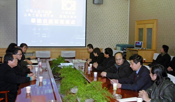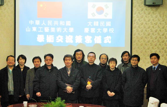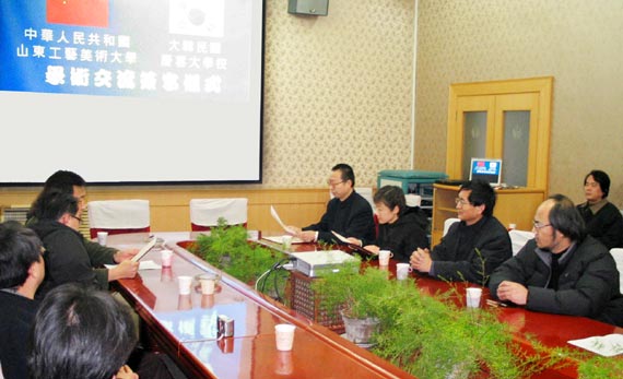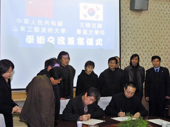 山东工艺美院办公室王立果主任主持了签字仪式。韩国大邱视觉艺术协会的其他客人及山东工艺美院李新副院长、教务处李友生处长、科研处胡希佳处长,装潢系苗登宇主任、赵进副主任和各教研室主任及师生出席了签字议式。