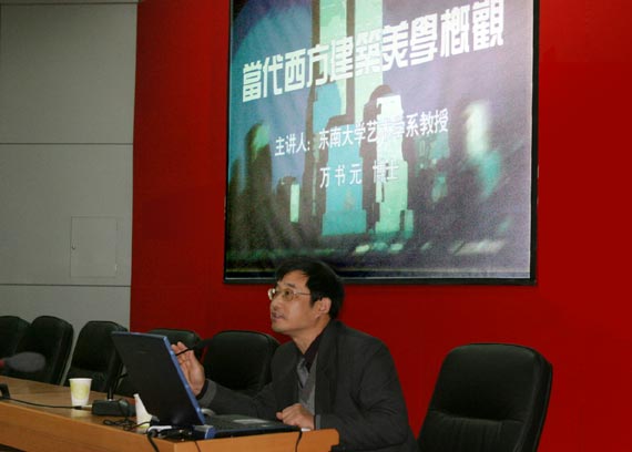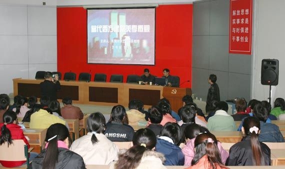 28日下午两点半,万书元教授为同学们作了主题为“当代西方建筑美学概观”的讲座,主要从美学的角度出发,以图文并茂的方式向同学们全面展示了西方建筑发展历程及阶段美学特征。针对同学们现阶段的专业知识的水平做了深入浅出、详略得当的讲述,分析了众多知名大师的著名建筑,使同学们对西方现代建筑的美学特征又有了初步了解和认识。