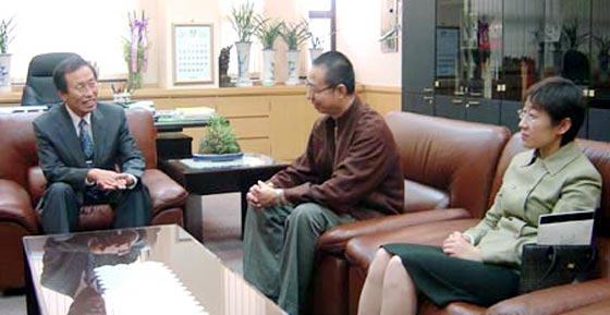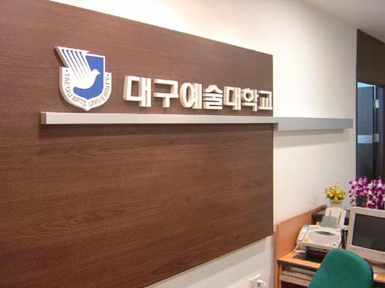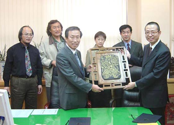 裴仁镐校长在校长办公室热情接待了潘院长一行。裴校长首先介绍了学校的概况,大邱艺术大学建校10年,在校生有1700余人,设有美术、设计、摄影和音乐4个系共17个专业。其中美术系有东洋画、西洋画、书法、儿童艺术教育4个专业,设计系有广告设计、影视艺术设计、服装设计、装潢设计和室内设计5个专业,摄影系有摄影与视觉传播两个专业。潘院长还与裴校长就设计艺术交换了看法,一致认为设计艺术在社会与生活方式中寻找设计语言。大邱艺术大学的校训就是“使设计成为生活化的创意,把学生培养成艺术的人才”。潘院长向裴校长介绍了我院的概况和办学理念,并赠送了我院的教师作品集和装潢系2003届毕业生作品集,裴校长对我院师生的艺术创作水平给予较高评价,并希望双方进行友好合作。双方认为在合作方式上可以互派教师和学生进行学术交流活动。