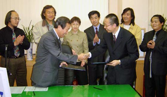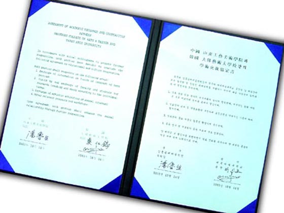 院长与裴仁镐校长在双方学术交流与合作协议书上签字。今后双方将在互惠的前提下交流信息;根据各自的研究课题互派教师访学和学生留学;举办相关的艺术活动以及其他课题研究和作品展览。在这个协议的基础上,双方将通过进一步的合作增进友谊。潘院长邀请裴校长在明年到我院访问,裴校长愉快接受了邀请。