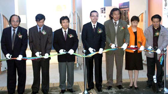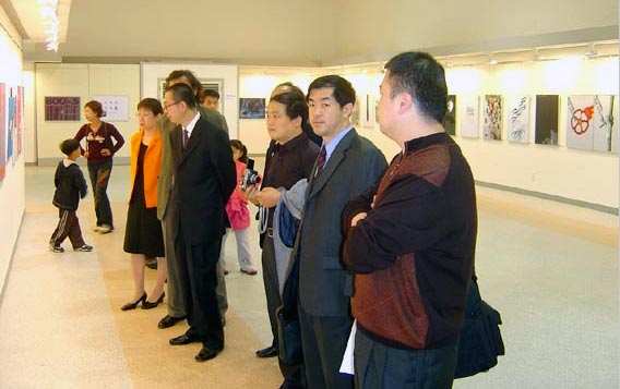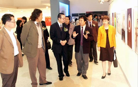 院长、李新副院长,装潢系王进生书记、苗登宇副主任,科研处胡希佳处长和职业技术学院石增泉副院长,韩国大邱市视觉设计协会崔仁寿会长、迟龙善秘书长及著名文化交流活动家何传乾先生为开幕式剪彩。中韩设计家一同观看了展览。
