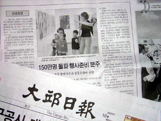 10月12日,由于韩国艺术活动开幕式一般在下午五时举行的惯例,访问团上午参观了国立大邱博物馆。此馆于1994年12月开馆,收藏品约达2万余件,馆内设有考古室、美术室、民俗室等常设展览室和一个特展室、体验学习室,用以综合展现出大邱、庆北西部、北部地区的史前、史后时期的文化。其中的特展室通过做拓本、仿做土器、尽情画画、磨磨石等活动,亲身体验许多古人的文化生活,以感性方式对青少年进行文化传承教育。