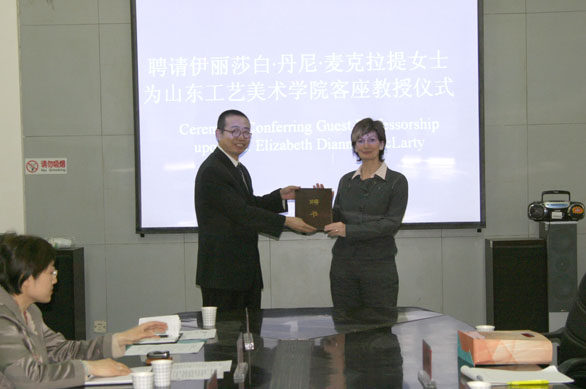 李新副院长介绍伊丽莎白•丹尼•麦克拉提女士简历并宣读聘书,潘鲁生院长向伊丽莎白•丹尼•麦克拉提女士颁发聘书。