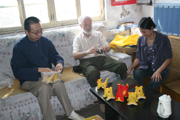 第二天,工作小组赶往潍坊高密,对扑灰年画、泥玩具、馍馍磕子等民间手工艺进行了考察。雷顿教授不仅参观了各种民间手工艺的制作过程,还对民间艺人就目前手工艺的生产状况、传承方式等问题进行了访问。在接下来的几天里,雷顿教授一行又先后在临沂河东、苍山,菏泽鄄城等地,对泥塑、布老虎、蓝印花布、织花土布等山东民间传统手工艺进行考察调研。9月5日,潘鲁生院长专门赶往临沂陪同雷顿教授考察了河东布老虎及苍山泥人。