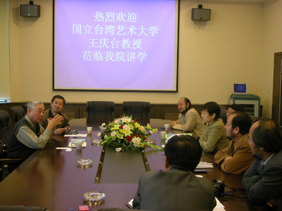 10月21日下午2点,王庆台教授在院办公楼二楼会议室与我院领导及有关人员进行友好座谈,参加座谈的有副院长李新、科研处处长胡希佳、外事办副主任康健、现代手工艺系系主任吴永福、美术系陈佶生等。座谈会就对中国传统艺术和西方艺术的看法及与我院科研课题合作事宜进行了探讨。座谈会结束后,王教授在副院长李新、科研处处长胡希佳等人的陪同下参观了我院美术馆和博物馆。下午4点,王庆台教授在总务处会议室为我院美术系研究生及部分院系的学生举办了一场名为《台湾区域文化特质:建筑石雕、建筑木雕》的学术讲座,王庆台教授深入细致地讲述了建筑石雕、建筑木雕这一台湾区域文化特质,使广大师生对这方面的相关问题有了比较全面的认识和理解。