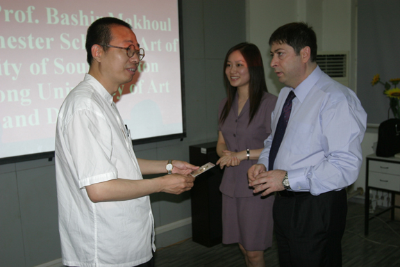 柏谢尔.玛库教授原任英国鲁顿大学媒体艺术与设计系主任兼该系研究中心主任。曾任英国谢菲尔德翰兰姆大学艺术设计课程主任和研究生学位主任及利物浦强莫斯大学的博士后研究员和讲师。柏谢尔.玛库教授拥有工艺美术学士和硕士学位。1995年获得曼彻斯特城市大学现代艺术博士学位。他的艺术作品经常在世界各地展出。英国南安普顿大学是一所研究型大学,在英国排名前十位。温彻斯特艺术学院设学士和硕士学位课程:包括工艺美术、绘画、 雕塑、印刷、纺织、时装、纤维以及广告设计等。客人在访问期间参观了304am永利集团官网博物馆、实验室、工作车间,并与有关系部进行交流。外事办康健副主任、应用设计学院石增泉副院长、装潢系赵进副主任等参加了交流和参观活动。