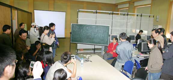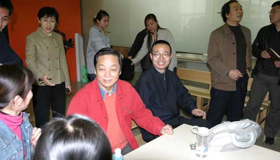 在艺术设计重点学科装潢设计实验室,韩美林与同学们热情交谈,回答了学生的现场提问。韩美林简洁地阐释了设计与装饰和传统艺术的融合问题,强调了丰富的优秀民族传统文化资源在当代艺术创作中的重要价值。韩美林先生率真爽直的性格和对于艺术、人生的真知灼见感染了在场的每一位师生。