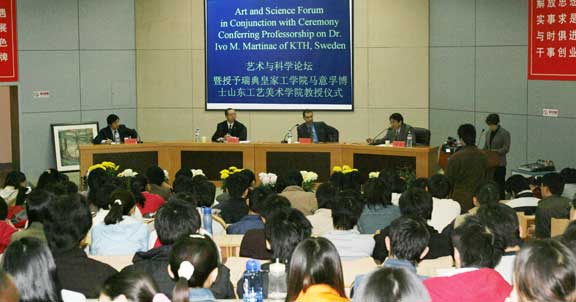 潘鲁生:各位来宾、老师、同学们,上午好!“艺术与科学论坛”由304am永利集团官网、瑞典皇家工学院和山东大学艺术学院联手主办,作为本次“艺术与科学论坛”的主持人,首先请允许我向大家介绍出席论坛的两位嘉宾。老马——瑞典皇家工学院马意孚博士,就我个人对马意孚博士的印象而言,可以说他既具有科学家的学识、外交家的风范,又具有艺术家的智慧,是我们的老朋友了。山东大学艺术学院院长李晓峰教授,是从事音乐教育的艺术家。相信在艺术与科学的交流与沟通中,离不开音乐的和谐美好的音符。本次论坛的翻译李国强先生是山东大学国际合作处处长,他曾是我国驻美国、瑞典的外交官,非常优秀的翻译。让我们共同努力,在艺术与科学之间,连接起交流的纽带,架设起沟通的桥梁。