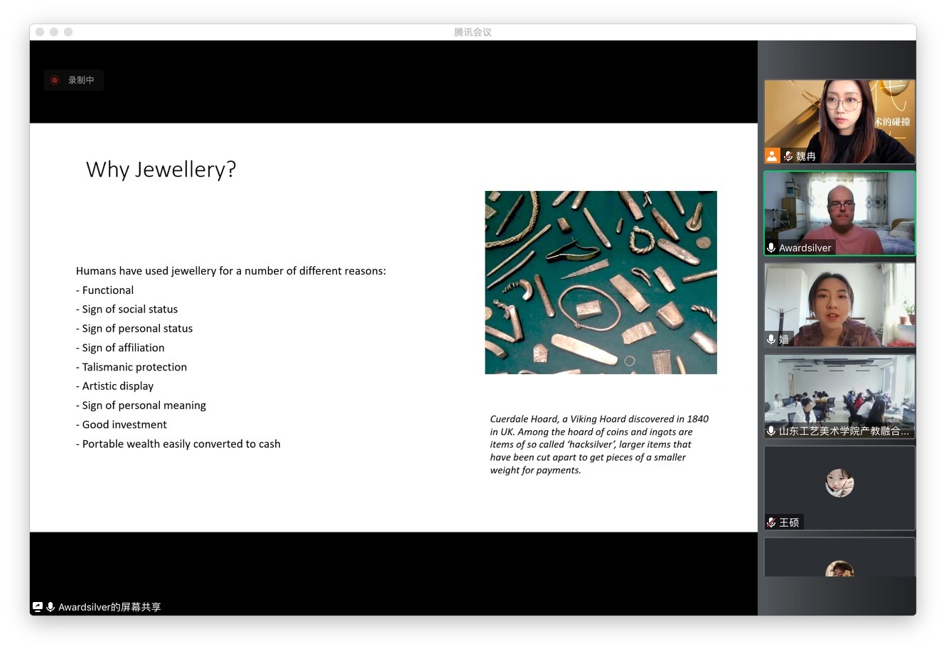 6月2日,青岛基地时尚设计学院《时尚配饰设计》中外联合课程外方授课启动,澳大利亚资深高级银奖首饰艺术家Adrian Ward夫妇受邀线上为学生讲授“当代首饰——时尚与艺术的碰撞”的专题。课程中方教师魏冉全程参与。