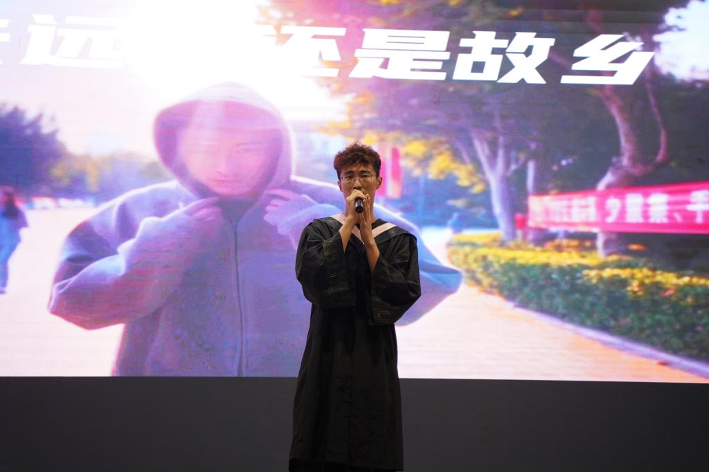 毕业生代表王浩然上台发言,回顾四年充实美好的大学生活,他代表全体毕业生对母校、老师、同学以及亲友致以诚挚的感谢和感恩。并表示作为新时代的青年学子,有责任肩负起新时代的重任,不负时代,不负韶华,成为新时代奋勇前进的开拓者,砥砺前行,以青春之名,赴时代之约。
