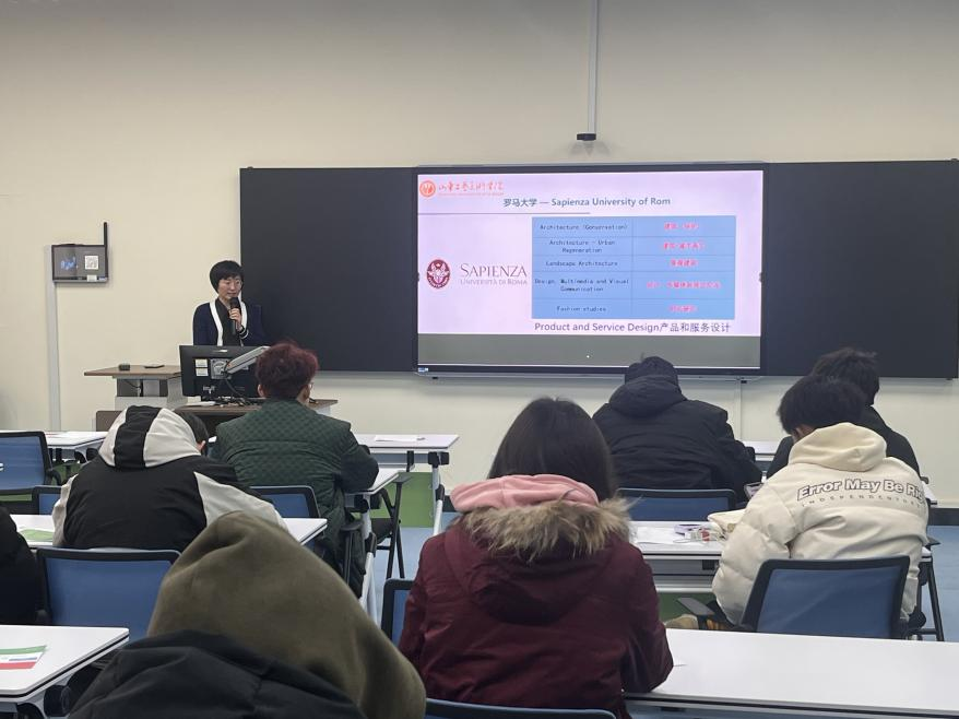 为帮助学生提前做好就业规划,给学生提供更丰富的升学路径,满足学生的发展需求,促进学生做好自己的学习生涯规划和选择,普及留学知识,拓宽国际视野,12月27日下午,视觉传达设计学院与建筑与景观设计学院于视觉2005多媒体教室联合举办意大利留学趋势及升学路径分析讲座。中睿意博文化创意(山东)有限公司郭荣静老师担任主讲人。毕业班辅导员高畅、韩晓旭参加讲座。