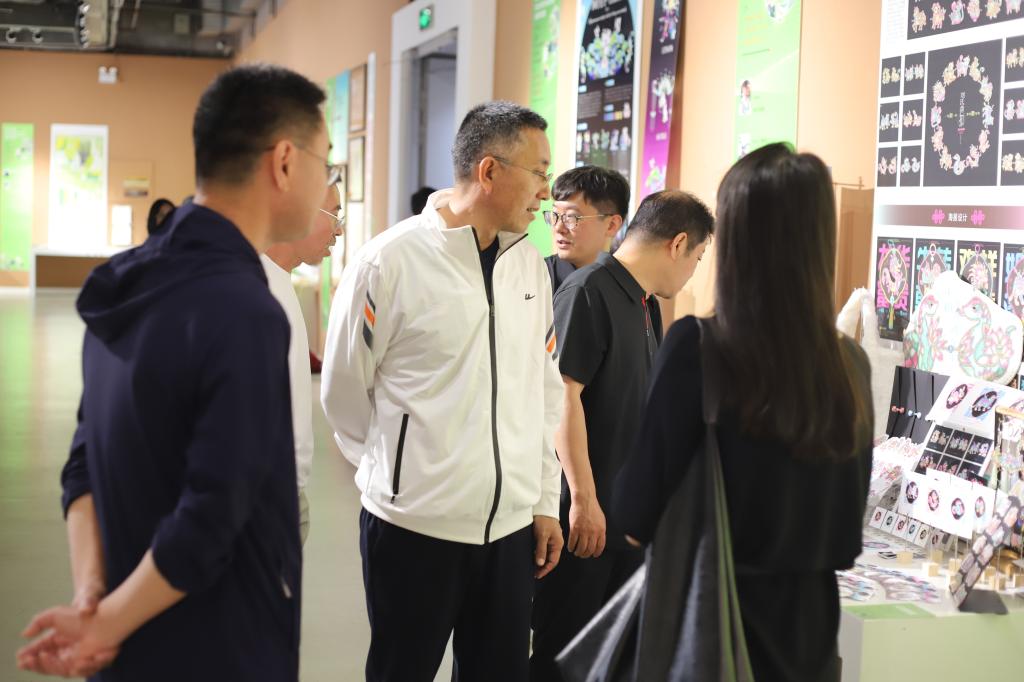 校领导在学院作品展区频频驻足,听取了学院领导、导师和作者的汇报与讲解。领导们首先对现场展出作品和学院研究生培养质量给予了充分肯定;并指出,专业硕士培养要更加注重校企合作,强调专业设计与市场资源的联合,琳琅满目的文创衍生品要推向市场,面向大众,走向社会,为学院接下来的研究生培养方案调整点明了方向。