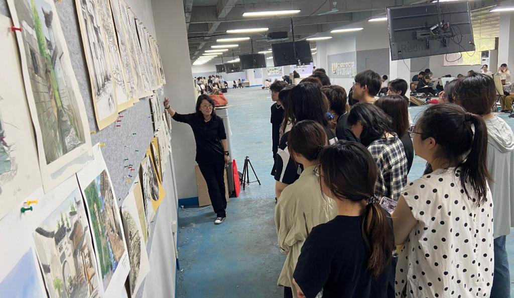 婺源李坑教学点,由带队教师曲展组织学生围绕古村落开展写生实践。王晓峰院长走进课堂一线,逐一查看学生作业,从构图技法、色彩运用、人文元素提炼等方面进行细致点评。她结合专业特色强调:“古村落是自然与人文共生的设计宝库,写生不仅是技法训练,更要引导学生观察建筑肌理、生活场景中的美学逻辑,将传统视觉语言转化为现代设计思维。”