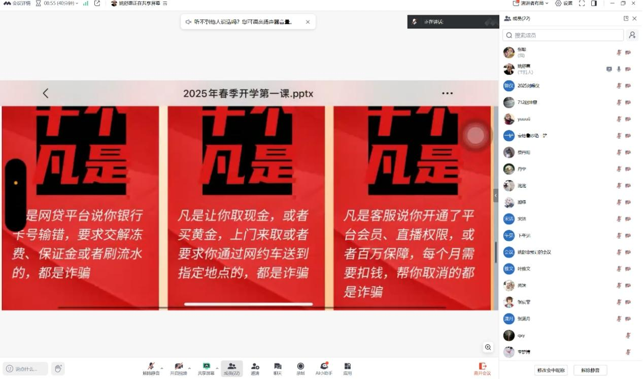 随后,班会聚焦于入学安全教育。从学业规划与要求,到国家安全、生命安全、消防安全等多个维度,进行了全面深入的讲解。着重强调了人身安全、财产安全、交通安全等方面的注意事项,同时对心理健康、反诈防骗以及宿舍安全卫生等内容进行了细致阐述,旨在强化学生的安全意识,提升自我保护能力,共同维护和谐稳定的校园环境。班会最后,明确指出了各年级在开学后的注意事项和纪律要求,敦促学生们尽快调整作息,严格遵守课堂纪律,以良好的精神风貌投入到新学期的学习生活中。