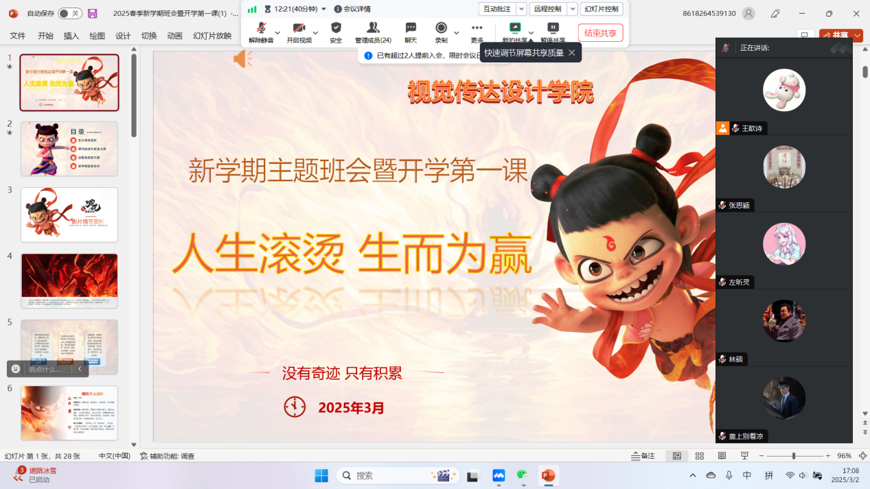 2025年3月2日,学院各年级分别召开开学第一课主题班会。本次班会以“人生滚烫 生而为赢”为主题,紧密围绕春节档热门电影《哪吒2》展开深入讨论。班会从影片的精彩情节赏析入手,剖析哪吒在影片中的成长蜕变之路。通过对哪吒角色的解读,鼓励同学们从中汲取奋进的力量,激励大家在新学期以饱满的热情砥砺前行。