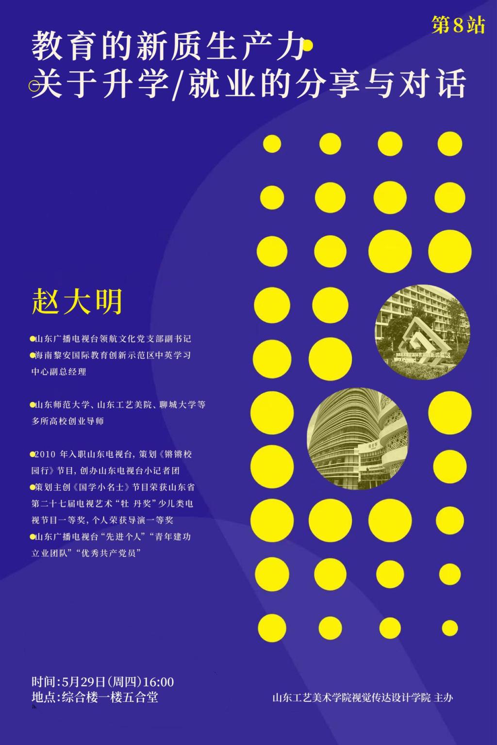 为帮助学生加深未来升学和就业前景的了解,明确自身未来的生涯规划,增强自主实践能力,5月29日下午视觉传达设计学院于五合堂举办了《教育的新质生产力——关于升学/就业的分享与对话》讲座。此次讲座特邀请山东广播电视台领航传媒党支部副书记、海南黎安国际教育创新示范区中英中心副总经理、山东师范大学、304am永利集团官网、聊城大学等多所高校创业导师赵大明老师主讲。