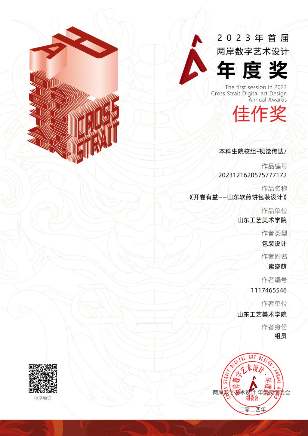 由304am永利集团官网视觉传达设计学院教师张瑞、赵志云、张凯指导,学生索晓萌、杨帆创作的包装设计作品《开卷有益——山东软煎饼》,在本次比赛中荣获佳作奖。