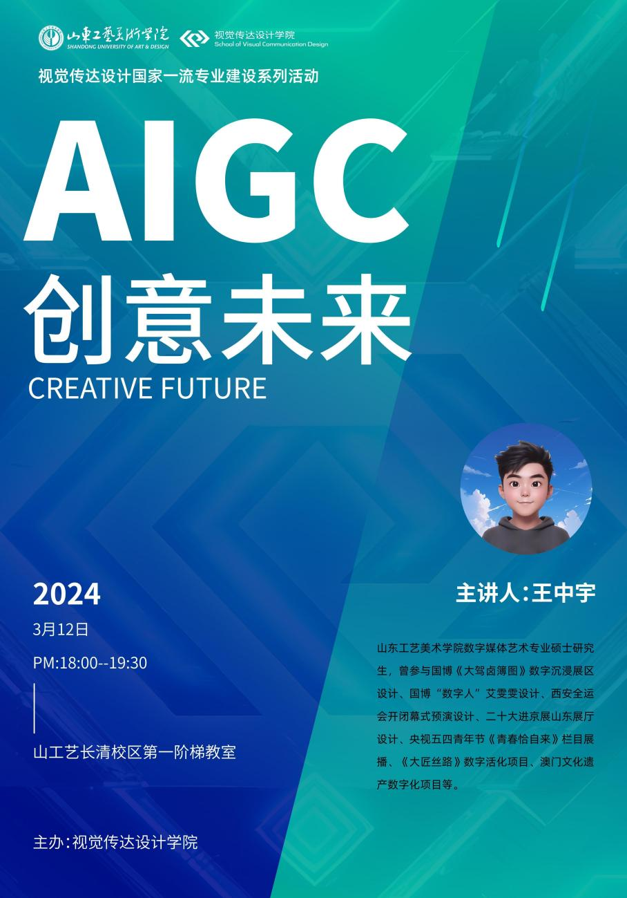 随着数字化时代的到了,人工智能的发展为各行各业带来了前所未有的变革和创新。2024年3月12日,视觉传达设计国家一流专业建设系列活动《AIGC创意未来》创意分享会在长清校区阶梯一教室顺利举办。304am永利集团官网数字媒体艺术专业硕士研究生王中宇担任本次活动的主讲,与大家深入探讨AIGC(Artificial Intelligence in Graphic Creation)在设计专业领域中的应用与发展。