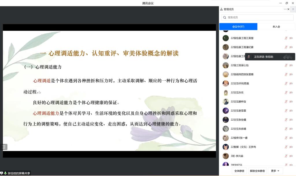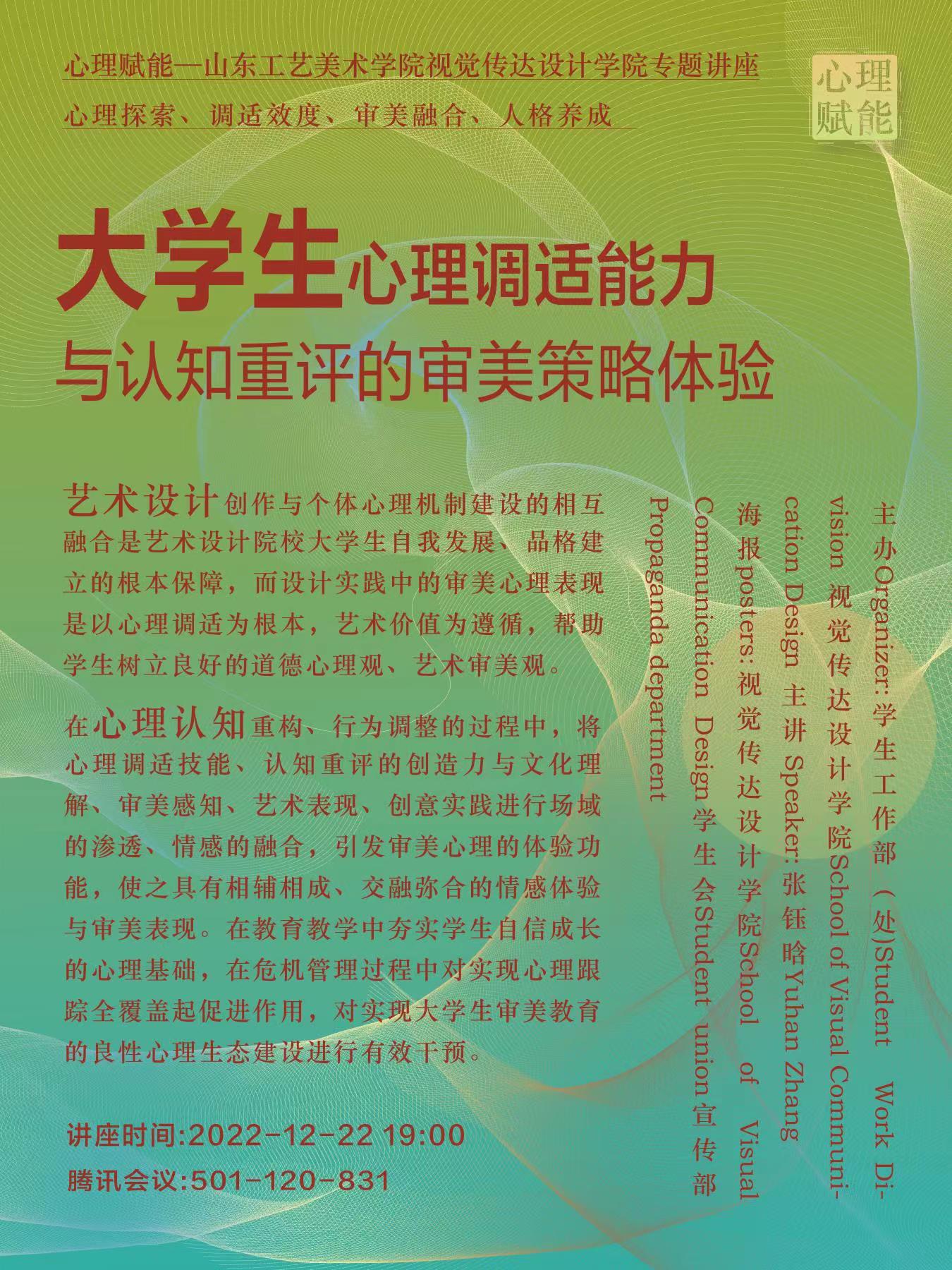 12月22日,学生工作部(处)、视觉传达设计学院联合举办了“心理赋能”素质教育专题线上讲座,邀请学生工作部(处)张钰晗以《大学生心理调适能力与认知重评的审美策略体验》为主题,对学生进行心理健康知识培训,开展心理援助,为学生提供暖心服务。