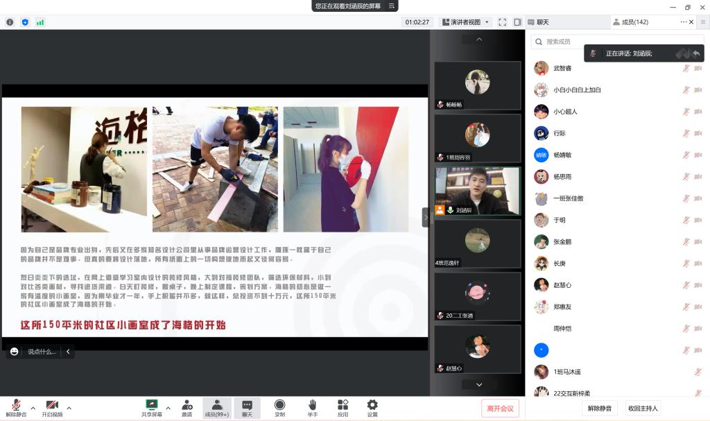 刘涵辰首先从自己大学时期所任职务和经历开始介绍,将自己创业想法的建立过程与同学们进行分享,启发同学们从身边小事做起,有目标要及时抓住。随后又将自己创立海格童画,一点一点从无到有,从小到大的创业历程进行分享,鼓励同学们有想法积极落实,找经验总结过程,勇创新敢于突破。最后,刘涵辰结合学院专业对当前的就业形势进行分析,对处在就业迷茫期,个人求职路径不明确等在校毕业生的突出问题进行解惑,鼓励同学们紧跟时代,勤于思考,不断尝试,早日找到心仪的工作岗位。