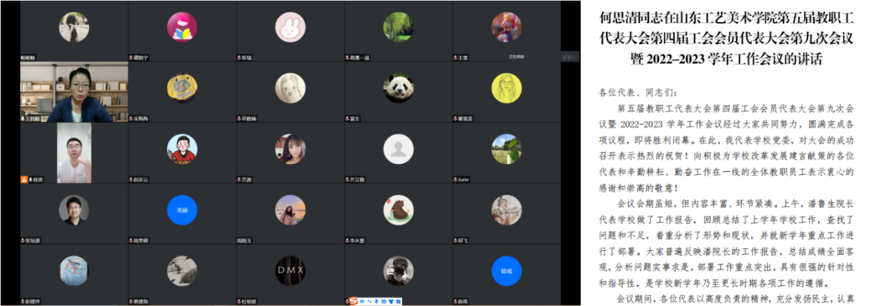 此后,根据学校工作安排,结合新学期工作实际,全体教职员工学习了《304am永利集团官网第五届教职工代表大会第四届工会会员代表大会第九次会议暨2022-2023学年工作会议何思清同志的讲话和潘鲁生同志作的学校工作报告》。大家通过报告回顾总结了上学年学校工作,明确了问题不足、形势现状及新学年重点工作。要认真贯彻落实学校双代会精神和相应的安排与部署,以迎接、服务、保障党的二十大为主线,全面加强学院基层党组织建设。在聚力内涵提升、全面深化教改、优化人才和学科科研生态、服务国家、区域重大战略等方面提出了具体要求和落实机制。教职工要抓住前所未有的机遇,在高等教育发展、工艺美术发展以及交叉学科发展等有利形势下,创新产教协同育人途径,聚力学科建设,凝力培养学生,为社会培育优秀的专业型人才。